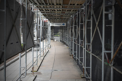 Protects pedestrians: Creates a covered walkway that shields the public from falling debris during façade work, renovations, or high-rise construction.